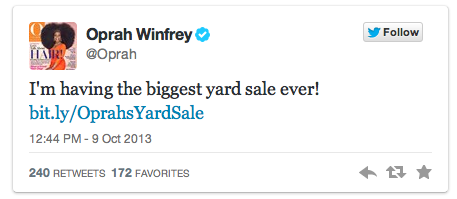 The first sale was dubbed “O’s Great Closet Cleanout” by the press, but with today’s technology, Oprah tweeted her own advertisement to her followers, “I’m having the biggest yard sale ever!”