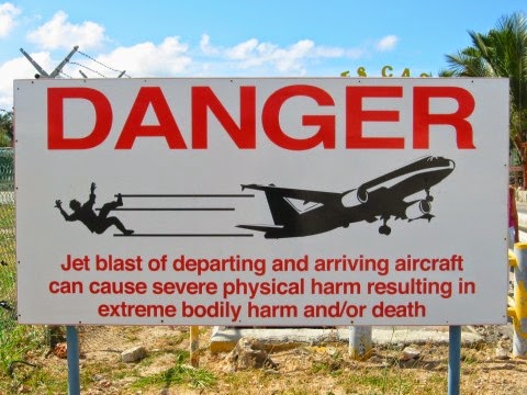 The warning sign posted on Maho Beach on the fence at the Queen Juliana Airport