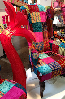 Patchwork velvet wing chair juxtaposed with a red plastic flower floor lamp.