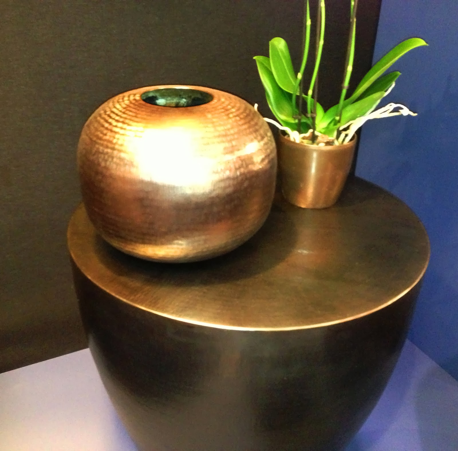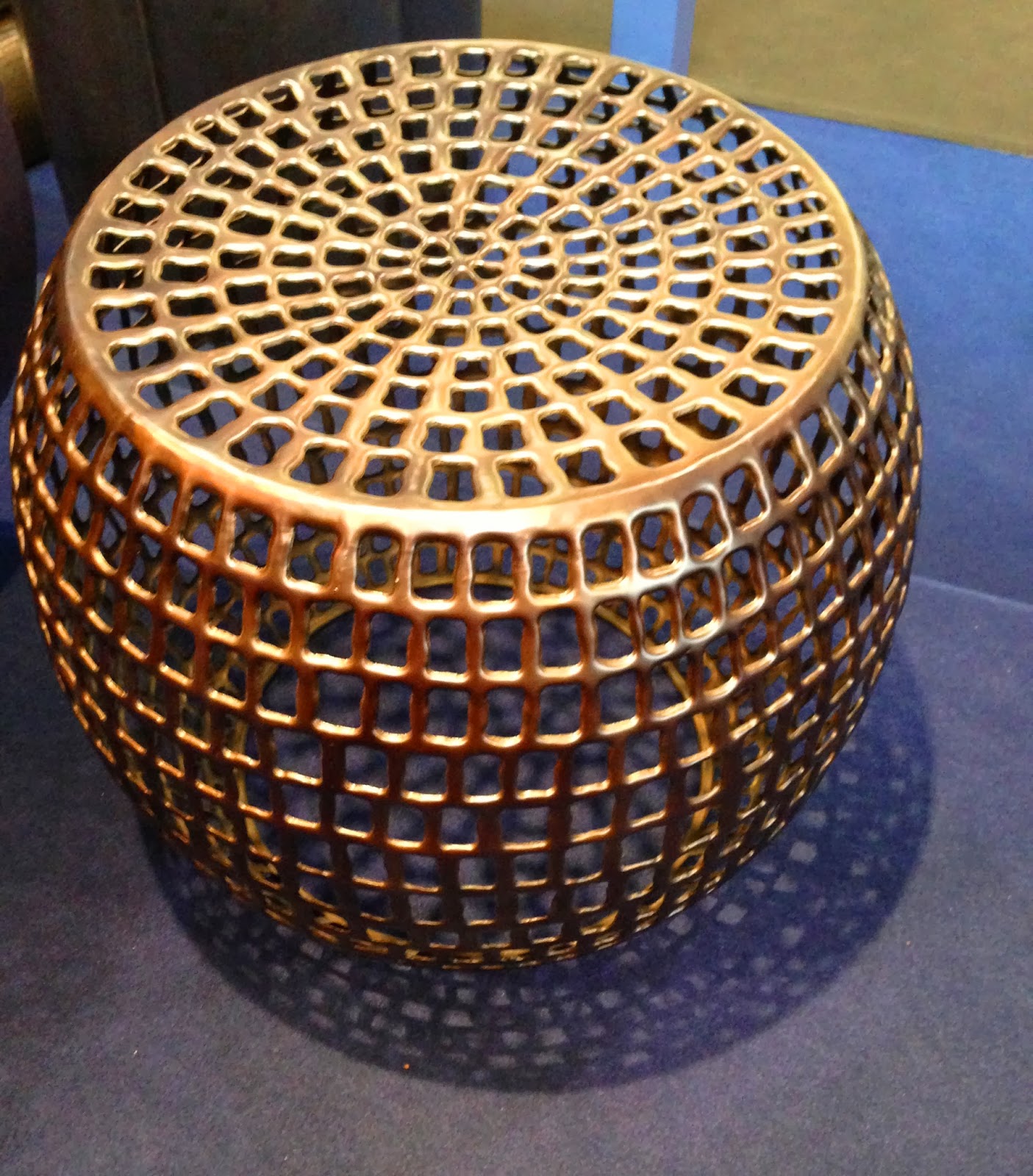One of our most exciting discoveries of the entire show was made today when we found the French maker of solid copper tables. These tables (and a few accessories) featured multiple patinas and hammered and scored patterns and detailing. Expect to see this collection of perfection in Cabana Home stores in mid-January.