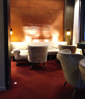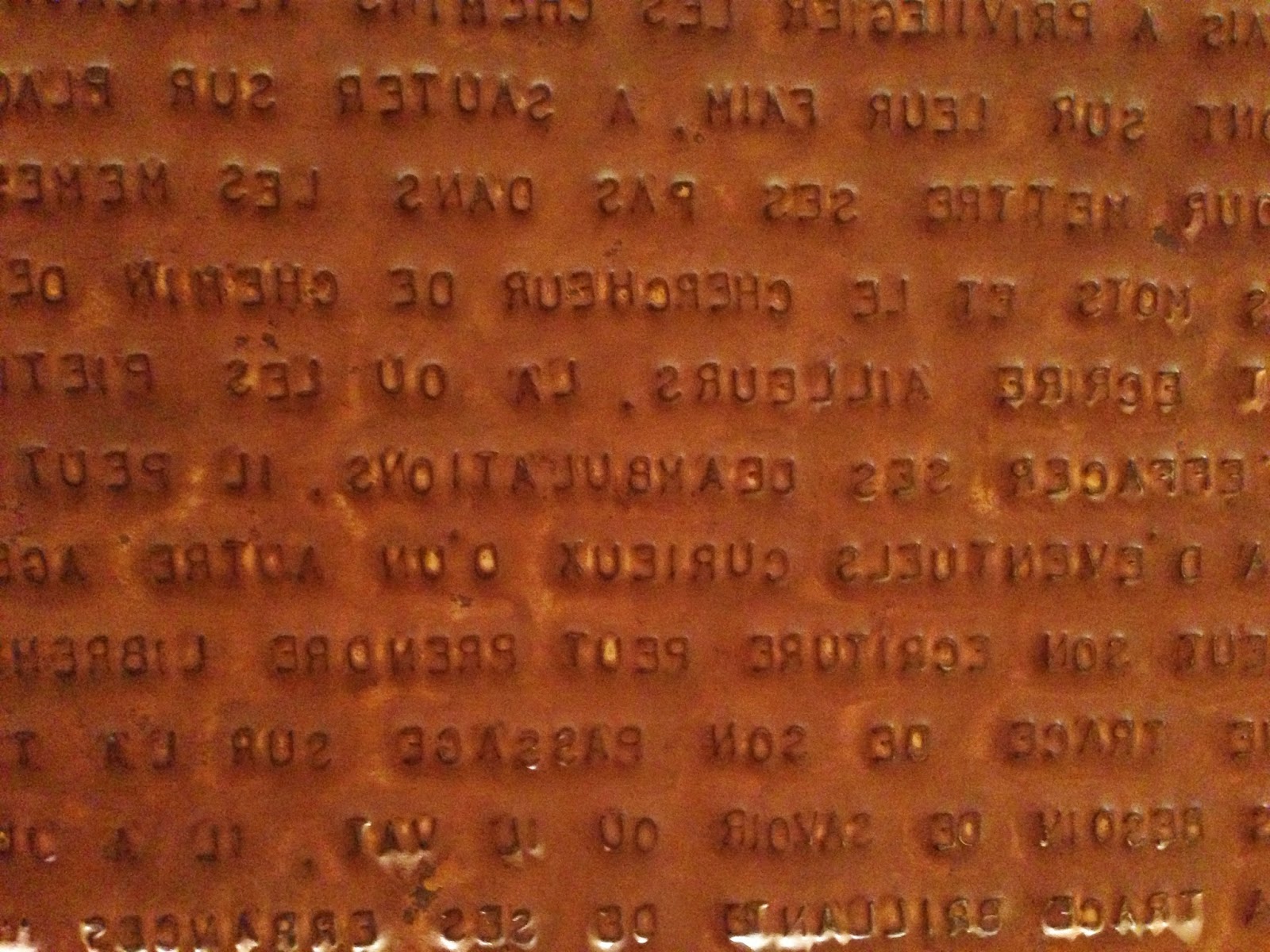 The back wall of the sitting area in the lobby was poetry (in French), letter pressed into metal.