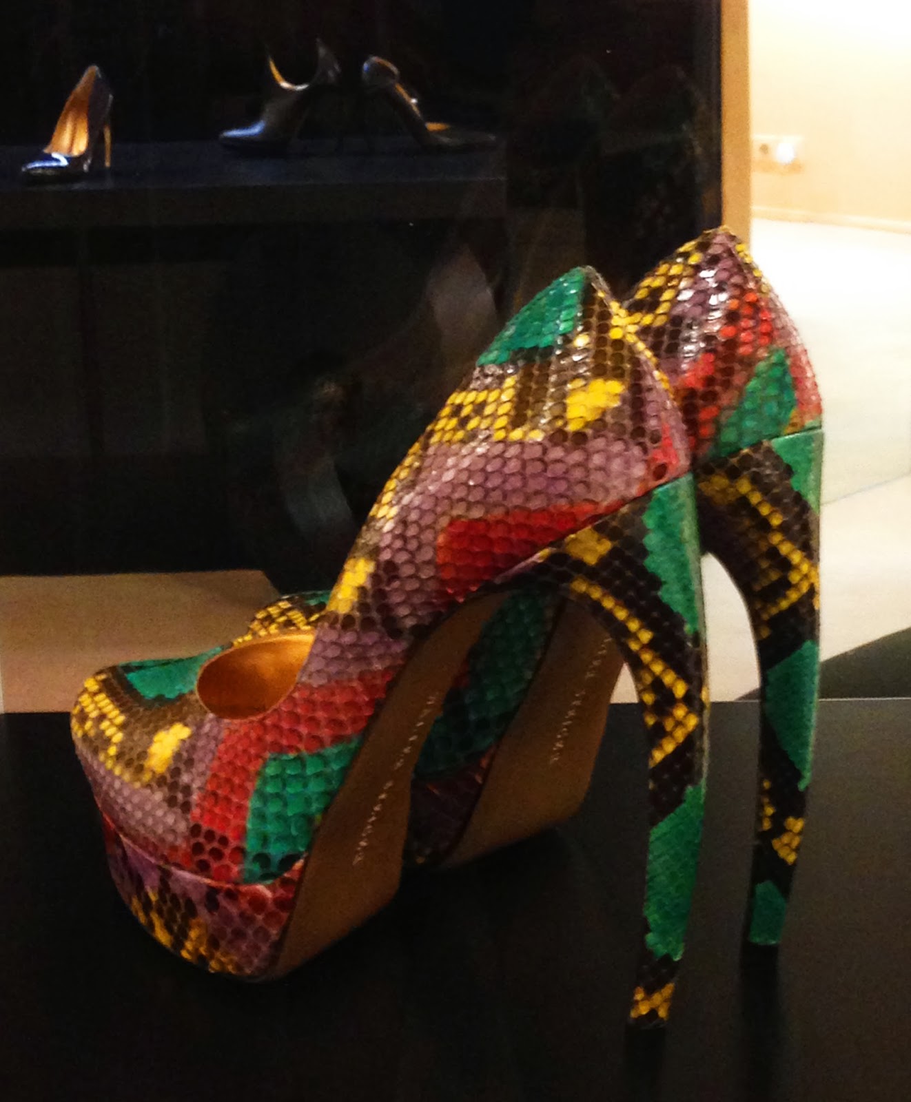Walter Steiger ‘Opportun’ pump in brightly colored Python, features the quintessential Steiger heel.