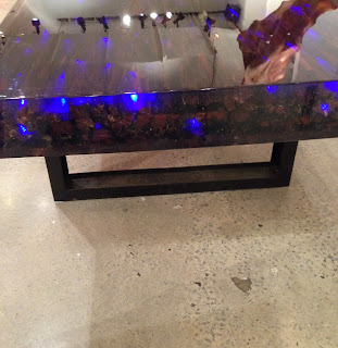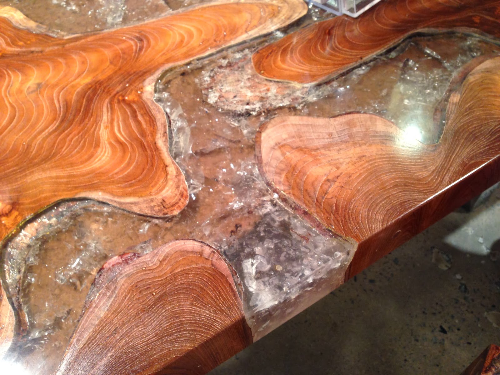 Ahh…I spy more wood in the back of this showroom. Big blocks of burled wood cut into blocks, one a dining table and the other a stool. The natural voids of the tree, once occupied by natural sap, sap wood, or perhaps a smaller branch were filled with clear Lucite crystals floating in hardened clear Lucite. The effect was super cool. The effect on a broader expanse such as on the Dining Table Top, middle and bottom pictures, below, looks almost as some naturally occurring landscape viewed from afar…perhaps the effect of global warming? (Thanks for the $5 bucks Mr. Gore).