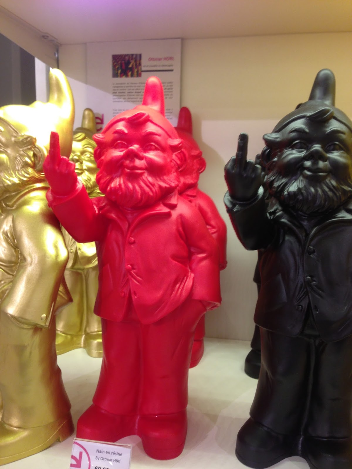 So, to take our mind off of possible dangers, we do what most (okay, maybe some) people like us do, we went shopping, first stop Printemps. Of course we were just trying to stay awake until the evening to help with the jet lag, so our interest in shopping was less than enthusiastic. I saw some humorous items which pretty much sums up our interest in shopping for fashion, below: